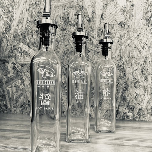 「OMOINOTAKE」ORIGINAL LOGOの調味料ボトル瓶です。 ご自宅の調味料(醤油・油・酢)を入れてお洒落にご使用ください。また、アレンジして、ミックス香辛料など入れると、だし醤油やフレーバーオイル・ビネガーもお楽しみいただけます!