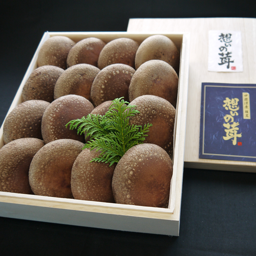 小さめの木箱に入った「想いの茸」はちょっとした贈り物に最適のサイズです。どんなシチュエーションでも喜ばれるギフトです。