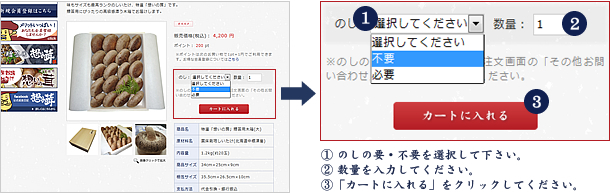 のしの不要・必要を選択し、数量を入力の上、「カートに入れる」をクリックします。