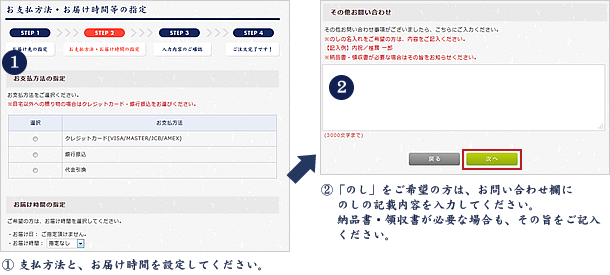 ※自宅以外への贈り物の場合は銀行振込をお選びください。お届け時間を選択し、ポイント使用の設定をします。「のし必要」を選び、名入れをご希望の方は、「その他お問い合わせ」にのしに記載する内容をご入力ください。納品書・領収書が必要な場合も「その他お問い合わせ」にてその旨をお知らせください。