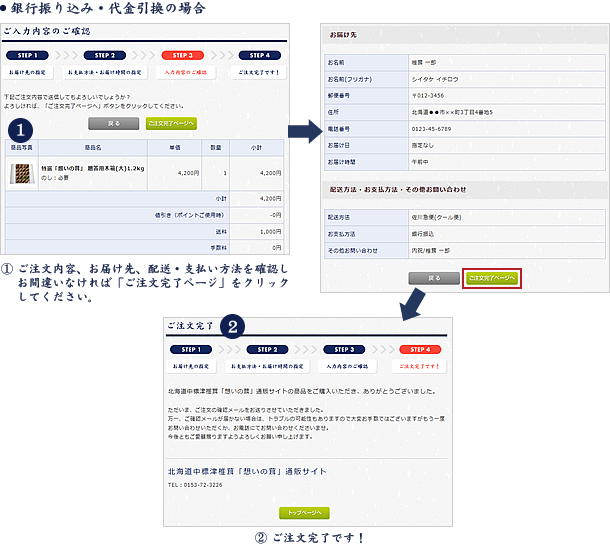 購入商品やお届け先、ポイントの使用などを確認し、お間違いがなければ「ご注文完了ページへ」、クレジットカードを選んだ場合は「次へ」をクリックし、カードの決済の手続きをします。これで注文は完了です。クレジットカード・代金引換を選んだ場合は、ご注文から5営業日以内に発送します。銀行振込を選んだ場合は、ご入金の確認から5営業日以内に発送します。ご注文より7日以内にお振り込みください。